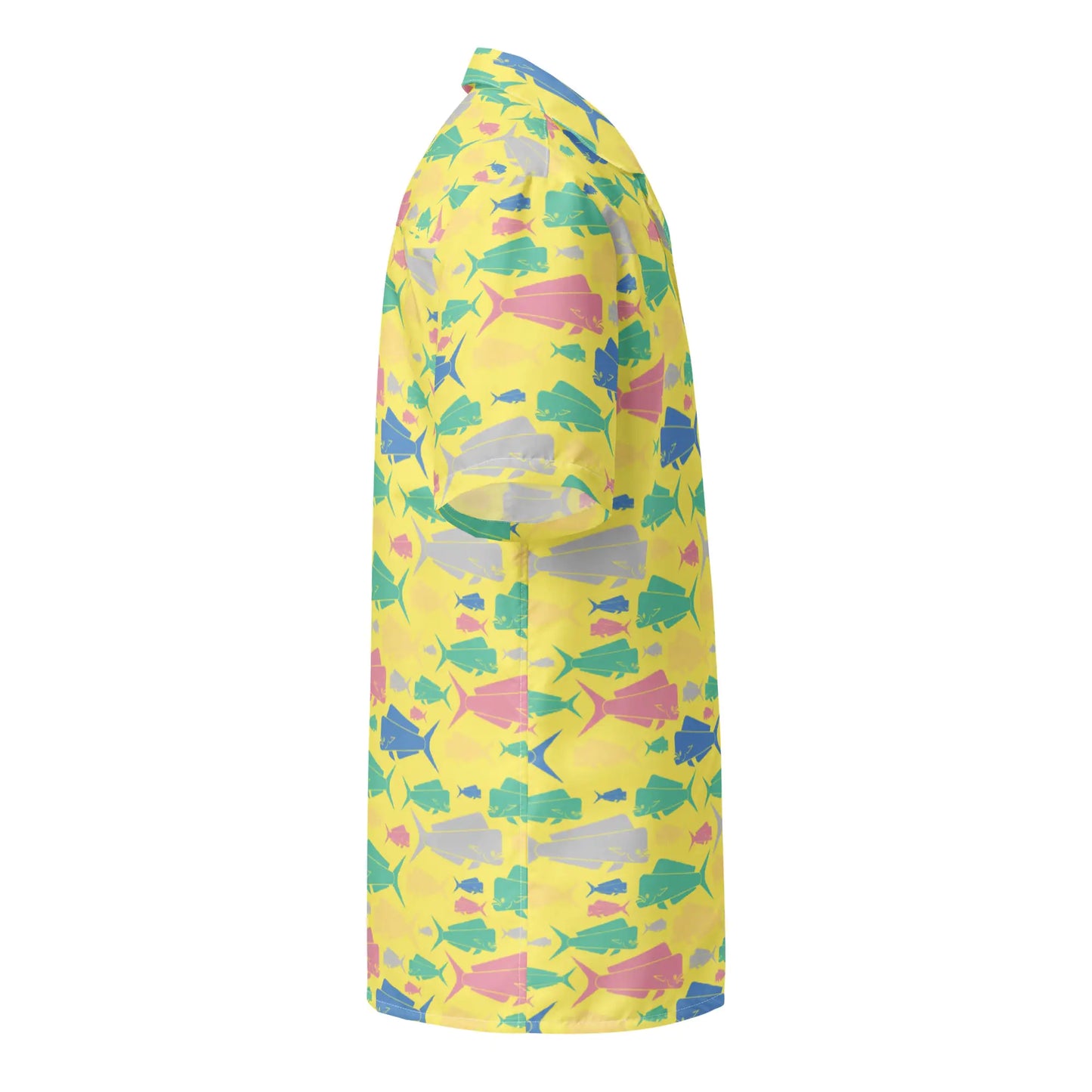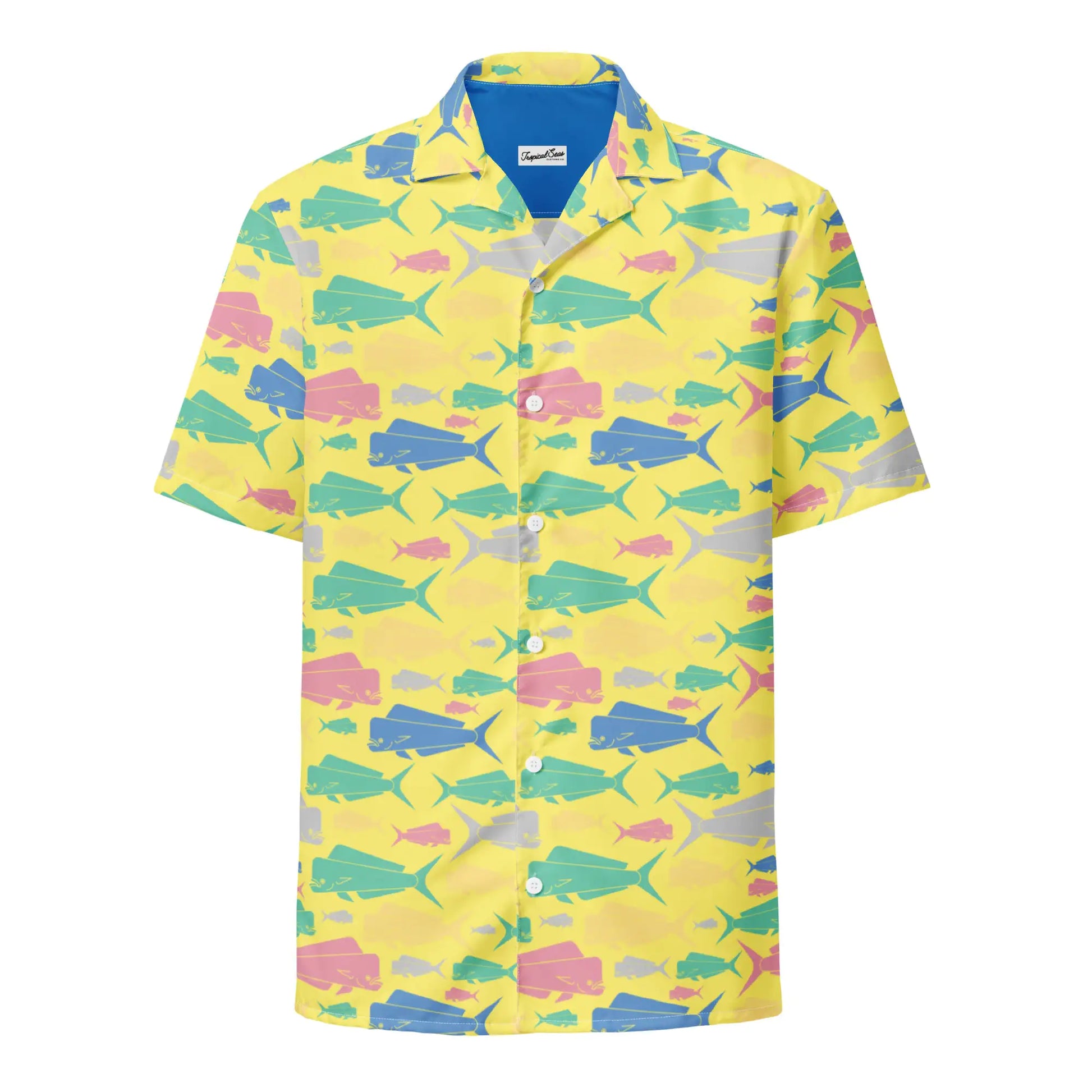 Embrace the island life with the Dorado Fish Island Hawaiian Shirt from Tropical Seas Clothing's Coastal Summer 2024 Collection. This men's short sleeve button-down shirt features a sunshine yellow base adorned with a vibrant Mahi Mahi pattern in blue, red, and green, complemented by a single-colored yolk.